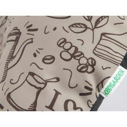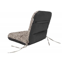 Die Rückseite des Kissens besteht aus einfarbigem Polypropylen-Vlies und ist mit einem Gummiband versehen, das zusammen mit den Schnüren zur Befestigung an einem Liegestuhl oder Stuhl dient.