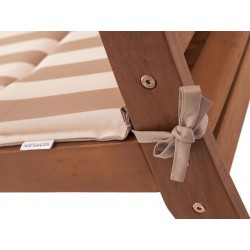Unsere Kissen sind leicht zu montieren. Binden Sie einfach die Bänder an der Liegeverkleidung fest und ziehen Sie das Gummiband über die Rückenlehne.