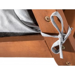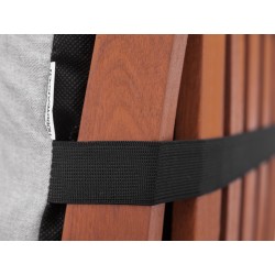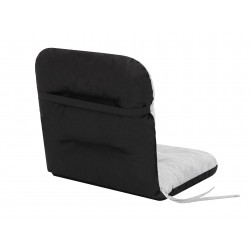 Die Rückseite des Kissens besteht aus einfarbigem Polypropylen-Vlies und ist mit einem Gummiband versehen, das zusammen mit den Schnüren zur Befestigung an einem Liegestuhl oder Stuhl dient.